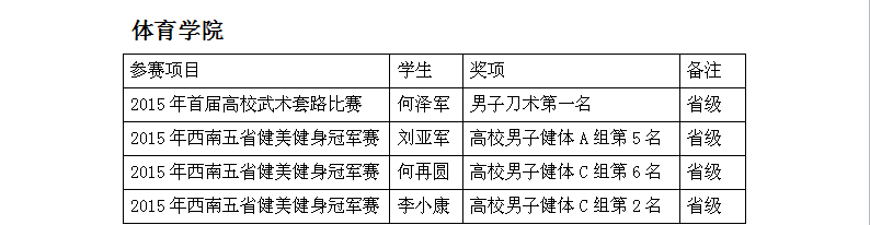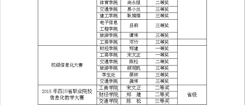 随着教育教学改革的不断深化,学校始终坚持“以生为本,以师为尊”的基本理念, 营造优良教风学风,鼓励师生积极参加各级各类比赛活动,促进师生全面提高。2015年,我校师生在各级各类赛事中,屡获大奖,国家级奖20项,省部级奖15项,市级奖10项。其中王丹老师在第六届“外研社杯”全国高职高专英语写作大赛中指导学生获得公共英语组一等奖;财经学院肖强、刘福宇同学在第二届“大智慧杯”全国大学生金融精英挑战赛中获得金融操盘手一等奖,体育学院何泽军同学在“2015年首届高校武术套路比赛”中荣获男子刀术第一名。