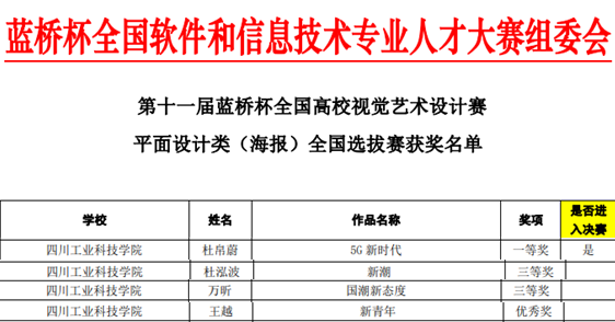 7月14日,“蓝桥杯”组委会公布了第十一届全国高校视觉设计赛全国选拔赛获奖名单,电子信息与计算机工程学院教师韦运玲指导的九组参赛作品中七组作品获奖,一组作品优先进入全国总决赛。