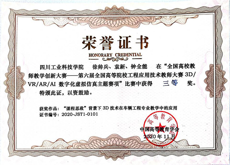 近日,学校智能制造与车辆工程学院“智能制造”团队教师徐帅兵、袁新和钟全能参与项目《“课程思政”背景下3D技术在车辆工程专业教学中的应用》在全国高校教师教学创新大赛——3D/VR/AR/AI数字化虚拟仿真主题赛项全国总决赛中荣获大赛三等奖。
