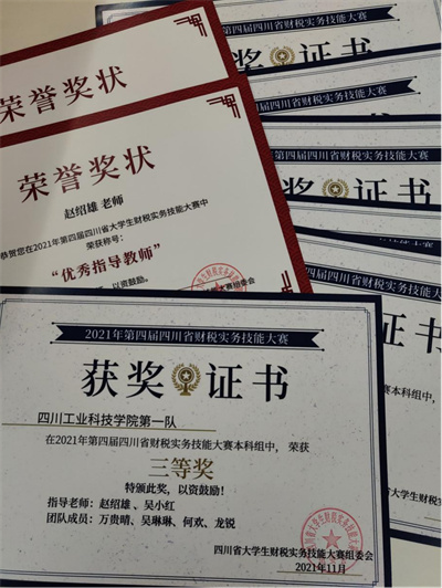 11月20日,在四川省教育厅主办的第四届四川省财税实务大赛中,财经学院2019级本科学子不负众望,在老师们的指导和同学们的充分准备下,张燕青、张树青、欧尚欣、李晓琳荣获一等奖,唐丽、唐雪、何欢、吴琳琳荣获二等奖。