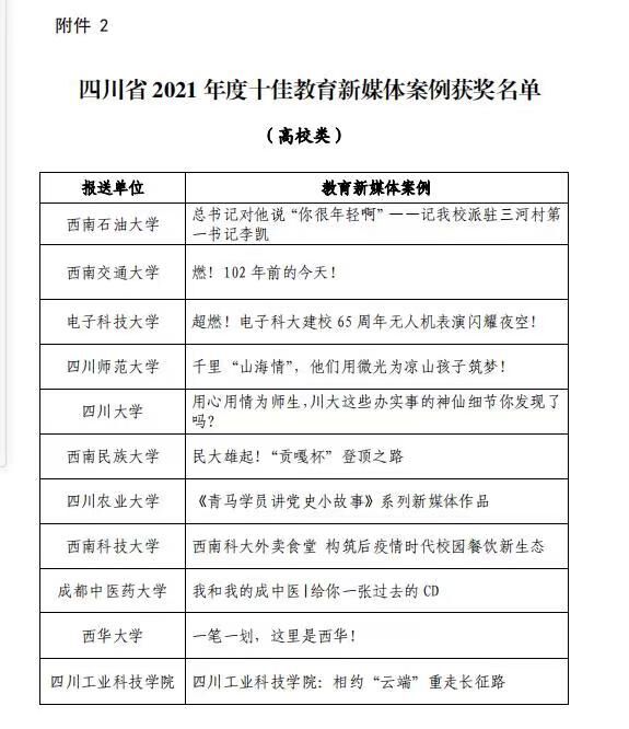 1月18日,从中共四川省委教育工作委员会、四川省教育厅获悉,学校“相约云端重走长征路”新媒体作品获评四川省2021年度十佳教育新媒体案例。