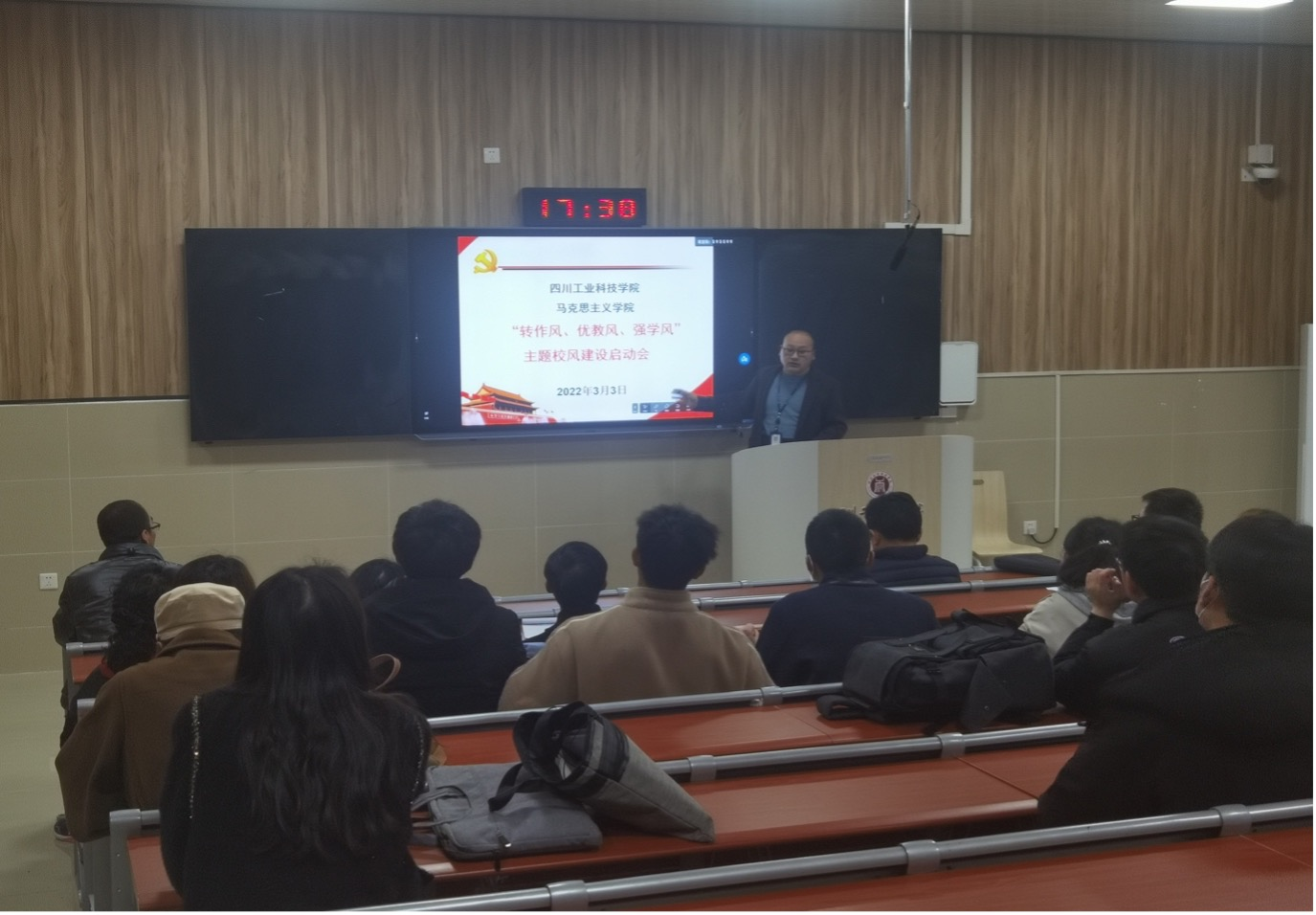护理学院、建筑工程学院、马克思主义学院、教育学院、电子信息与计算机工程学院等陆续召开了动员大会,各学院认真分析了目前工作作风、教风和学风方面存在的问题,明确了近期多项整改措施和预期效果,力争通过此次活动,工作作风、教风和学风能够得到根本好转。其中,建筑工程学院党政领导带领全体教职工重温了教师誓词;电子信息与计算机工程学院成立了以院长为组长,教学办、学工办、教研室行政人员等为组员的30人教学监控组,分6个小组对学院日常教学情况进行巡查。