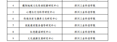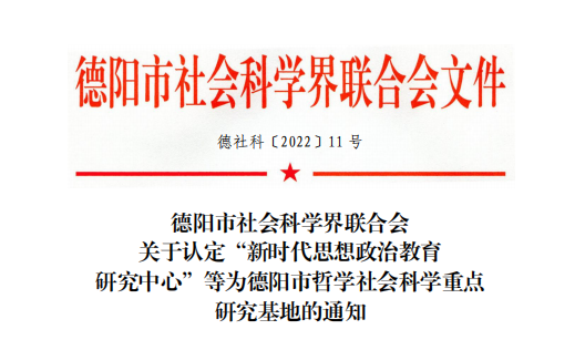 4月6日,德阳市社科联哲学社科下发了《关于认定“新时代思想政治教育研究中心”等为德阳市哲学社会科学重点研究基地的通知》。学校申报的德阳地域文化传承创新研究中心、心理与行为科学研究中心、传统体育与康养文化研究中心、家庭教育服务指导研究中心、红色歌谣研究中心和文化旅游发展研究中心成功获批。