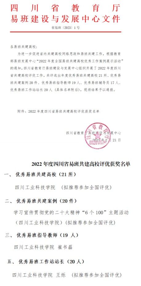 近日,四川省教育厅易班建设与发展中心发布了《关于2022年度四川高校易班共建工作评优结果通报》,学校在2022年度四川省易班共建高校评优工作中荣获优秀共建高校、《学习宣传贯彻党的二十大精神“6个100”主题活动》获评优秀易班共建案例、党委宣传部崔书磊老师获评优秀易班指导老师、易班学生工作站副站长王烁同学获评优秀易班工作站站长。