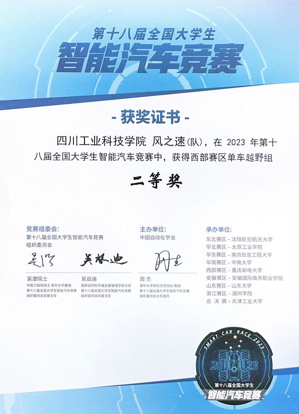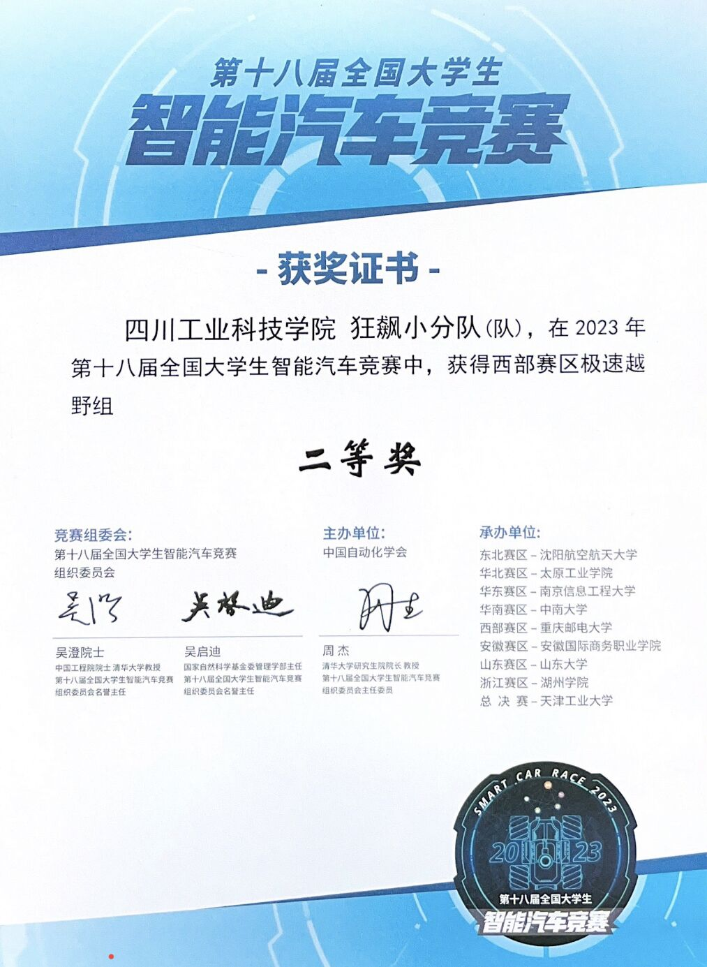 其中,三轮摄像头组“夏夜知声队”在预赛66支队伍中排名第九,挺进决赛,在决赛中击败了西北工业大学,西南交通大学,火箭军工程大学,长安大学,西华大学等知名院校,最终获得第十五名的好成绩;极速越野组“狂飙小分队”在省赛中获得三轮摄像头组三等奖,在不到一个月的西部赛备赛期内,转战极速越野组,最终获得该赛道西部赛二等奖。