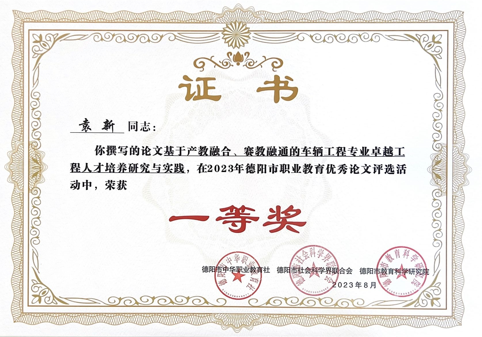 喜讯——学校袁新副教授获德阳市职业教育优秀论文一等奖
