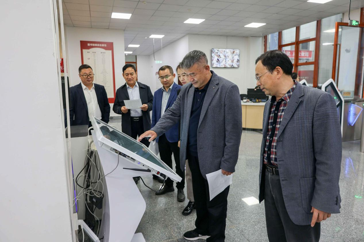 校领导深入了解了学校师生图书借阅情况,体验了图书馆的信息检索机和自助借还机的借阅流程,并来到各楼层书库分别借阅了图书文献。