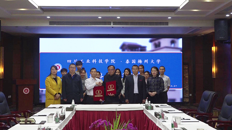 3月27日下午,“四川工业科技学院—泰国梅州大学战略合作签约仪式”在学校图书馆国际会议室举行。学校党委书记魏崛、泰国梅州大学奔塔·猜勒博士出席签约仪式,仪式由副校长黄斯欣主持。学校理事杨敏、外事部门相关同志以及泰国留学生参加了签约仪式。