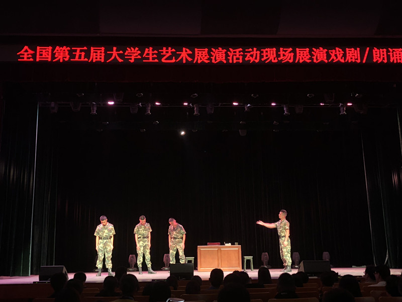 4月17日,表演团队不辞辛苦,充分利用有限的时间,反复推敲细节,力求做到最精最好。晚八点,学生们个个热情饱满、激情高涨,以最佳的状态闪耀登台。幽默诙谐,精彩动情的堪比专业化的表演博得了现场评委和全国各高校大学生们的热烈掌声,不少观众眼里还噙着激动的泪花,连声称赞,整个表演圆满顺利!我校戏剧小品《时刻准备着》作为全国唯一一个学生军训国防教育题材参展节目,受到了领导、评委和各参演高校的一致好评!