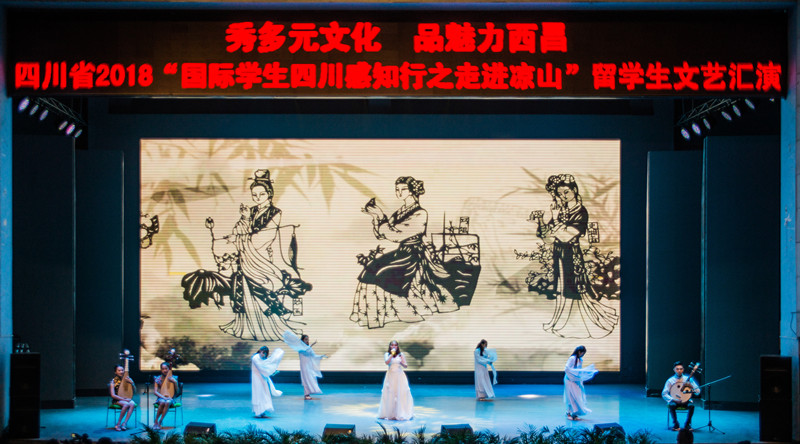 25日晚,我校国际学生受邀参演四川省首届国际留学生文化节文艺晚会,该晚会是四川省2018“国际学生四川感知行之走进凉山”系列活动之一,有全省10所高校不同风格的优秀作品在晚会中展出。我校参演作品为民乐歌武—《乐品四大名著》,本节目将经典的四大名著乐曲—《卧龙吟》、《葬花吟》、《天宫迅音》和《好汉歌》进行改编,以上音乐融合中国古典舞、太极扇、琵琶与中阮合奏、刀术、剑舞等表现形式,整个节目形式新颖、内涵丰富,体现了留学生对中华传统文化的深入思考与理解。