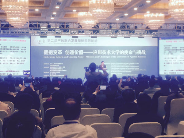 背景资料: “驻马店论坛”被喻为教育界“达沃斯论坛”,旨在汇聚国际和国内应用型大学,聚焦产教融合主题,共商高校转型发展大计,2014年首届论坛达成的《驻马店共识》对中国高等教育改革发展有里程碑的意义。本届论坛由应用技术大学(学院)联盟、中国教育国际交流协会、教育部学校规划建设发展中心主办,驻马店市人民政府、黄淮学院承办。论坛以“拥抱变革、创造价值——应用技术大学的使命与挑战”为主题,围绕“应用技术类型高校在国家创新体系中的地位与使命”、“新兴战略性产业与高层次技术技能型人才培养”、“‘一路一带’与中外科技大学合作”、“应用技术大学创新能力建设”等议题展开。整个会议呈现三个特点,一是规格高。不仅主办单位规格高,而且教育部鲁昕副部长亲自参会并就进一步认清应用技术大学的使命和挑战、加快地方高校转型发展作了指导讲话。外国专家演讲时采用同声传译形式,体现了国际会议的标准配备。二是范围广。206家地方高校、11家行业大学、27所国外境外高校及教育机构、31家行业企业、12个教育主管部门、10家政府部门和76位国内特邀嘉宾、48位国外境外特邀专家学者,共600余人参会。三是信息大。短短两天安排1个主论坛、11个分论坛、50位国内、外专家作主题发言,既能吸取“接地气”的国内高校转型发展举措和教训,也能借鉴“高大上”的德国、新加坡、美国等先进发达国家高校的先进经验和做法。