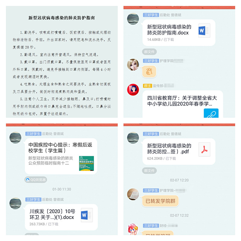 及时宣传引导,正确科学防控。后勤管理处充分认识到此次疫情防控工作的严峻性和复杂性,高度重视防控工作,密切关注疫情发展情况。我处党员干部曾德斌同志立即行动带头展开防控工作,利用教职工工作群等网络渠道发布新型冠状病毒感染的肺炎防护指南、防疫相关工作指引等,及时宣传疫情防控知识,引导师生正确科学做好自身防护,安全出行,这也是后勤管理处2020年给师生们的第一条温馨提示。正是这样的后勤人,正是这样坚定不移地为广大师生服务的后勤精神,默默地向师生传达“我坚守您放心”。