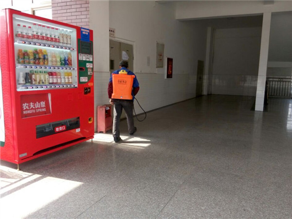 后勤员工正在对教学楼进行消毒