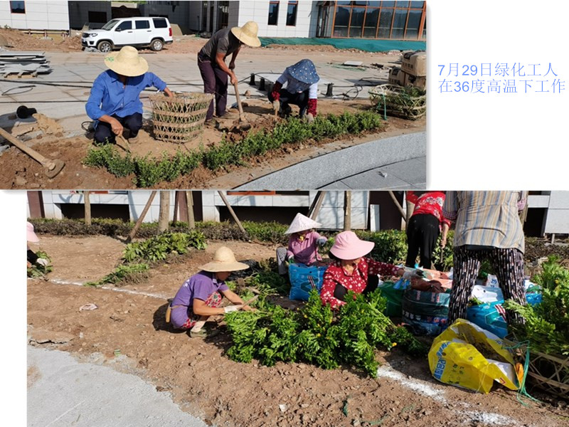 近两个月以来,后勤管理处环卫绿化科在做好学校日常环卫工作的同时,加大了扩建工程绿化的工作力度。由于是新址,该区域绿化难度大。首先,工人们在三十多度的高温环境下工作感到很吃力,藿香正气液几乎是工人们每天的必需品;其次,平地翻土需要大量的人力,耗时较长;另外,持续的高温天气使后期绿化养护困难。