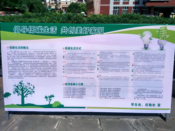 为低碳节能周创造良好的宣传舆论氛围,利用学校各班级的黑板报组织学生进行了一期低碳节能知识的板报宣传,利用宣传电子屏滚动式播放节俭名言,摆放展板十余块等方式,提高了学生的节能意识,丰富了节能知识;发挥校园广播站的作用,介绍低碳节能的意义、做法,扩大了宣传的影响面和广泛性。