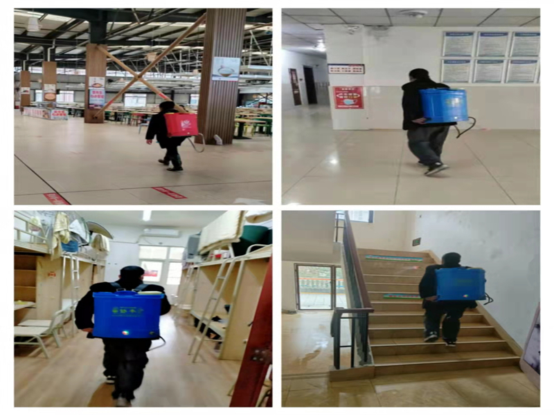 工作人员秉承“全覆盖、无死角、无盲区、无空白”的原则,背着数十斤的消杀设备,穿梭在校园的各个角落。他们从“心”开始,从“细”着手,按照规范的消毒步骤,对教学楼、学生公寓、食堂、图书馆、卫生间、垃圾池、电梯等重点区域进行了全面消毒杀菌。