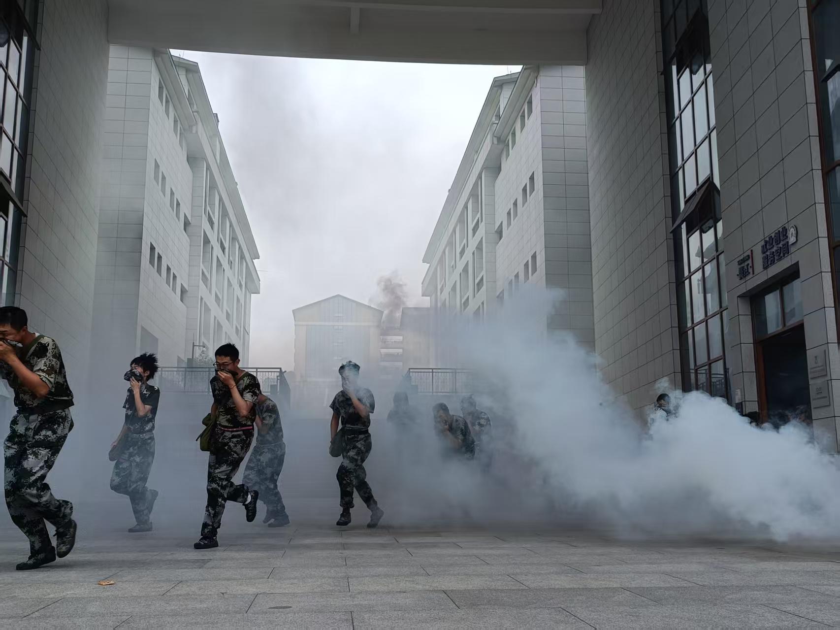 随后,应急逃生演练正式启动。随着警报声响起,所有学生弯腰低姿、捂住口鼻,沿预定路线快速撤离至安全区域,全程行动规范有序。