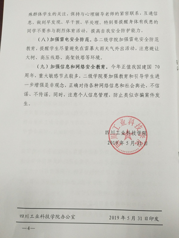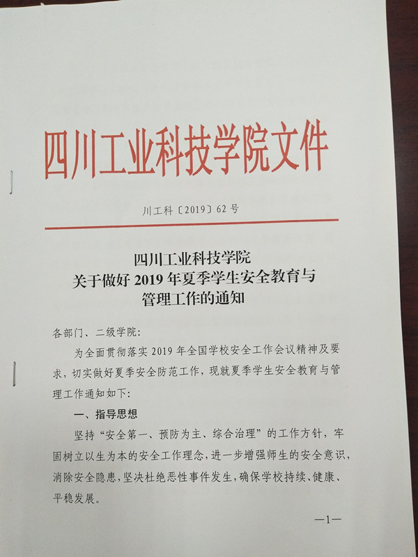 四川工业科技学院关于做好2019年夏季学生安全教育与管理工作的通知