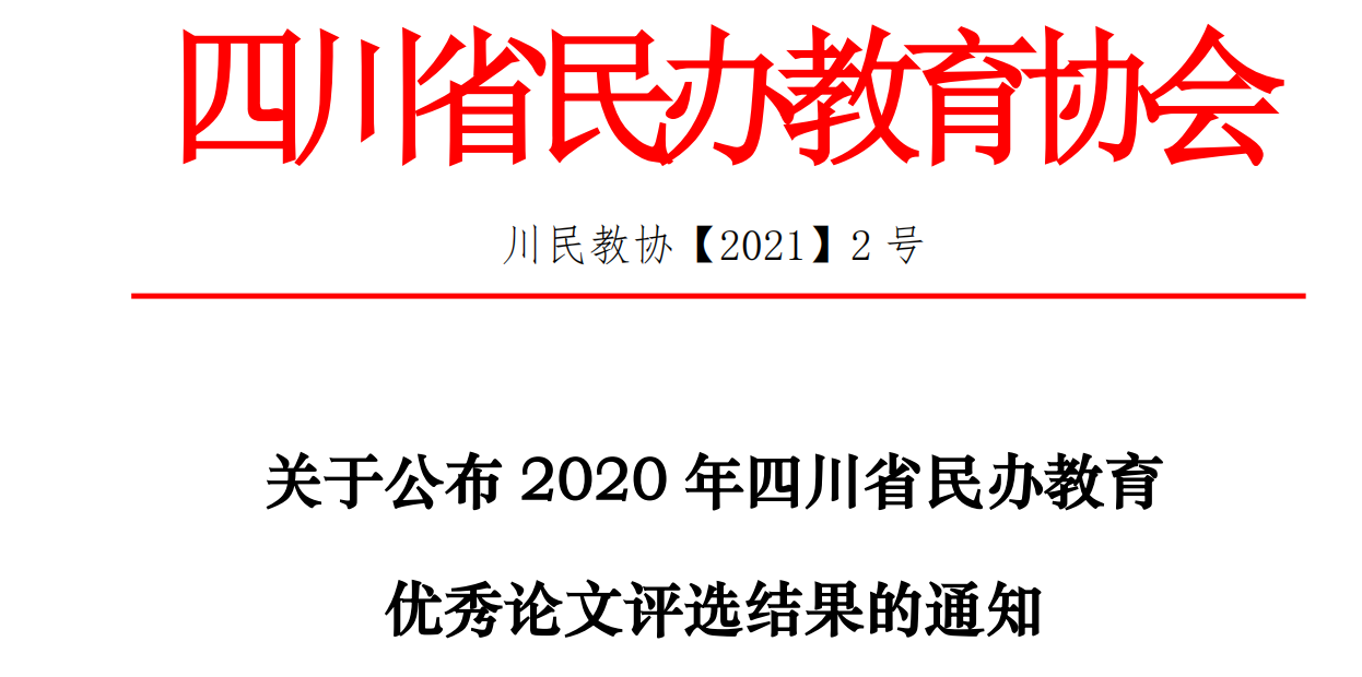 日前,四川省民办教育协会对2020年优秀论文进行了评选, 我校报送的《先验知识对大学生创业机会识别的影响:创业自我效能感和创业警觉性的 链式中介作用》等8篇文章均获奖。