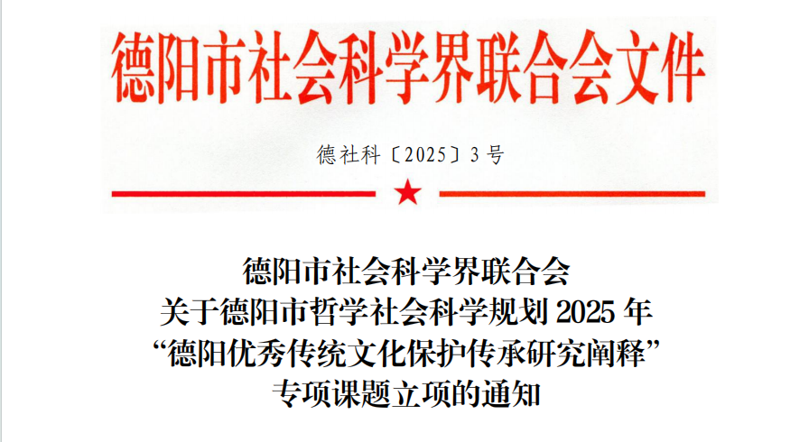 近日,德阳市社会科学界联合会公布了德阳市哲学社会科学规划2025年度“德阳优秀传统文化保护传承研究阐释”专项课题立项名单。学校杨玉梅和郑春华老师主持的项目成功立项。