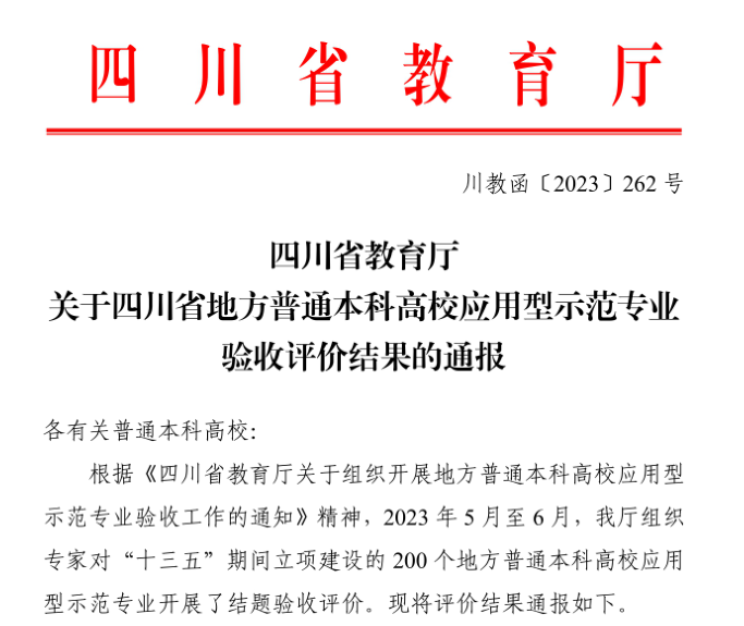 9月4日,四川省教育厅发布了《关于四川省地方普通本科高校应用型示范专业验收评价结果的通报》(川教函〔2023〕262号),我校2个专业全部成功通过验收。通过验收的专业分别为车辆工程和物流管理专业。