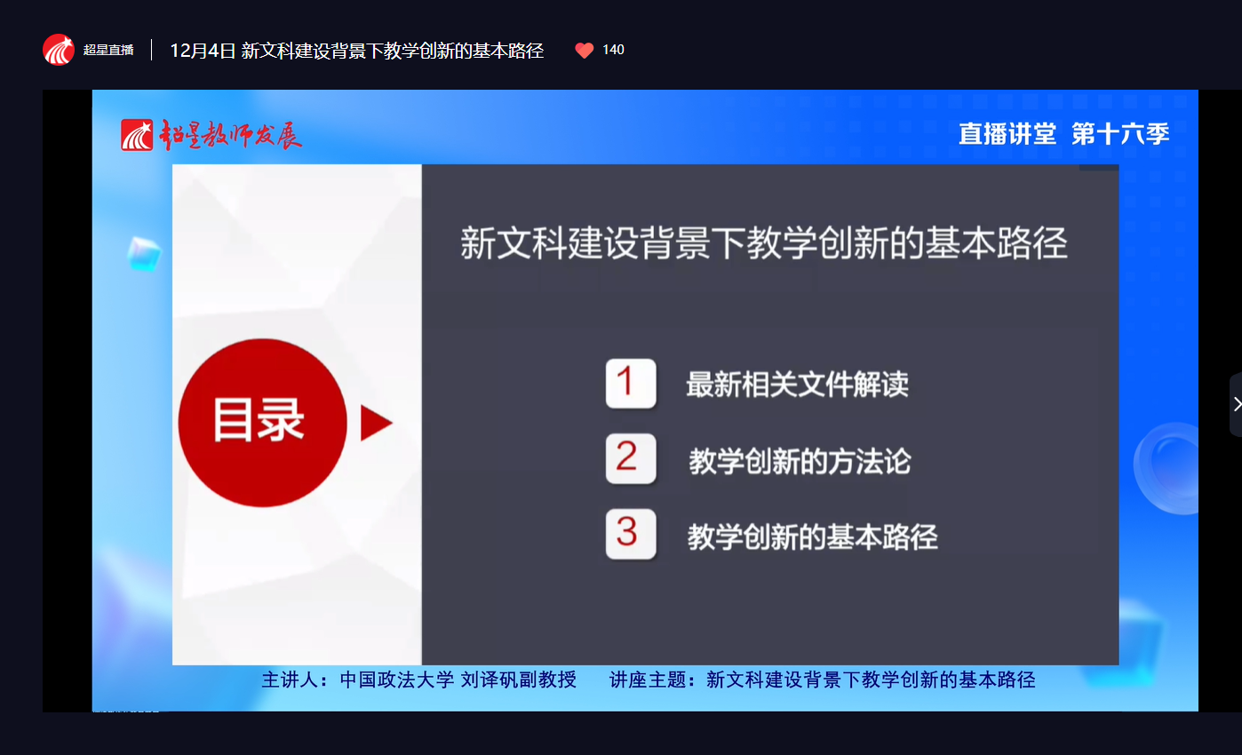 12月4日下午,由超星教师发展中心组织的直播讲堂第十六季第11期线上讲座顺利举行。本次活动特邀中国政法大学刘译矾副教授担任主讲,面向全校无课教师,围绕《新文科建设背景下教学创新的基本路径》这一主题展开深度分享,旨在助力教师把握时代脉搏,更新教学理念,提升育人质量。