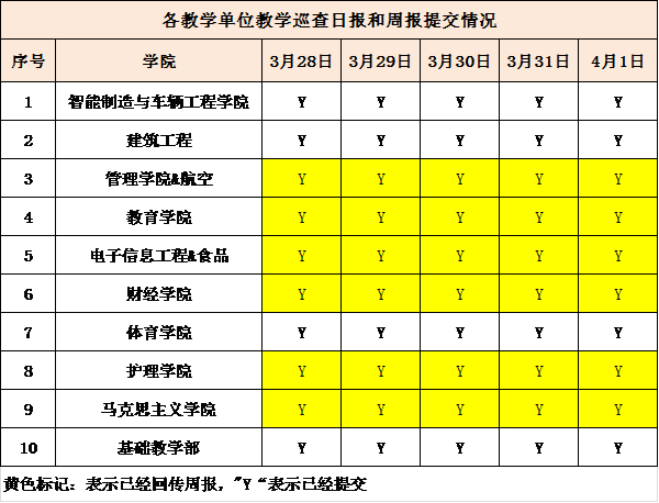 本期(3月28日至4月1日)教学质量监控相关工作主要包含:听课全覆盖(督导+同行)、学生出勤签到规范、持续深化“老带新”机制、全区域全时段进行课堂巡查,现就上周情况做如下通报:
