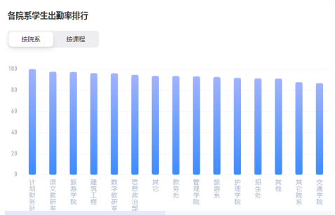 全校上周学生整体签到率为82.01%,具体各院系情况如下,请各教学单位提高学生签到率。
