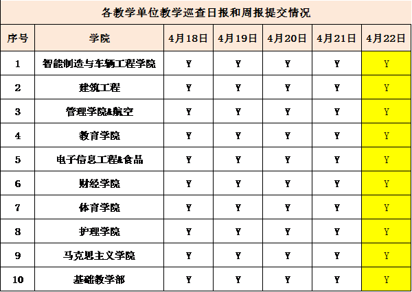 本期(4月18日至4月22日)教学质量监控主要采取线上+线下巡查相结合的方式进行,二级学院、教务处、督导办三方协同推进教学质量提升,教学秩序总体井然,现就上周情况做如下通报: