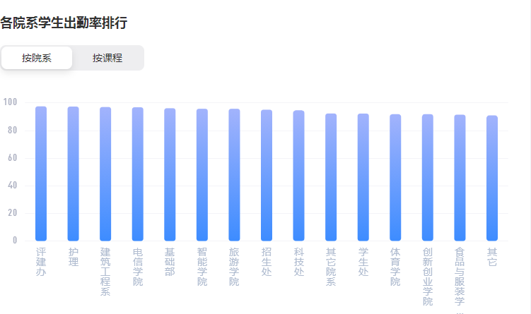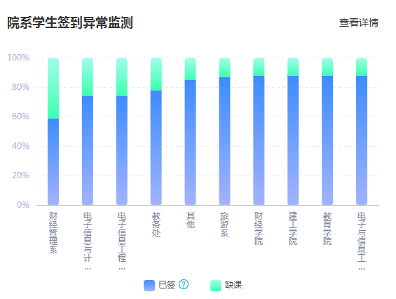 全校上周学生整体签到率为88.61%,具体各院系情况如下,请各教学单位提高学生签到率。