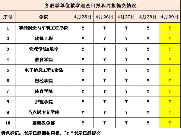 本期(4月23日至4月27日)教学质量监控主要采取线上+线下巡查相结合的方式进行,同时,开展教学质量月活动及期中教学检查,以推动教学质量建设,教学秩序总体有序,现就上周情况做如下通报: