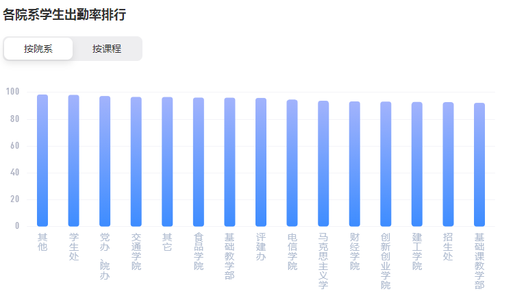 全校上周学生整体签到率为90.54%,具体各院系情况如下,请各教学单位持续提高和完善学生签到率。