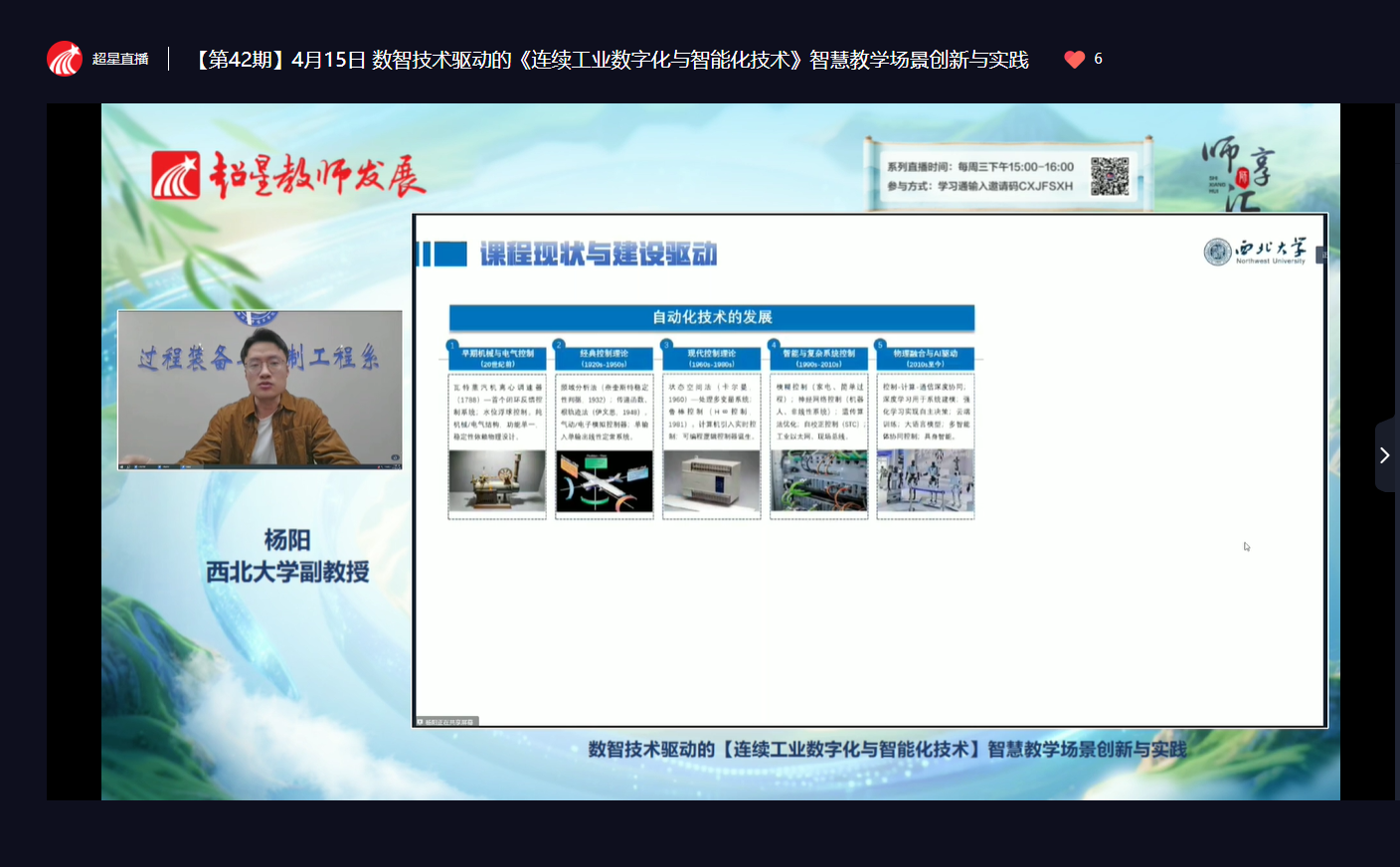 为深入推进教育数字化转型,提升教师数智化教学能力,4月15日下午,学校教师教学发展中心组织全校无课教师参加了超星【师享汇】第四十二期线上直播讲堂。本期活动特邀西北大学杨阳副教授作题为《数智技术驱动的<连续工业数字化与智能化技术>智慧教学场景创新与实践》的专题分享。