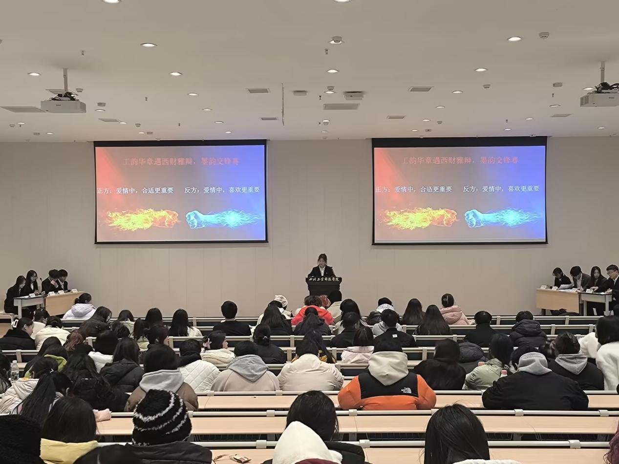 12月11日,四川工业科技学院的龑江校区B区报告厅内人声鼎沸,一场以“工韵华章遇西财雅辩,墨韵交锋”为主题的辩论赛在此拉开帷幕。本场比赛辩题为“爱情中,合适和喜欢哪个更重要”,四川工业科技学院的正方辩手沈钰坤、程志远、唐廷蕴、夏玉,逻辑清晰、条理分明地阐述了合适的重要性;西南财经大学天府学院的反方辩手蔺菲菲、李天旭、柳觐玥、张佳蔚则以独特的视角和深刻的见解,为喜欢辩护。双方辩手在陈词立论、驳论、补充立论、攻辩、攻辩小结、自由辩和总结陈词等环节中,各展所长,妙语连珠,赢得了现场观众的阵阵掌声。