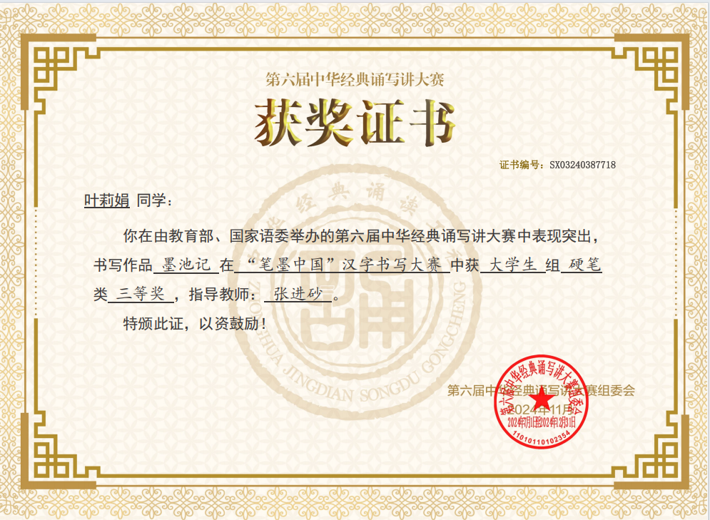 与此同时,同样来自教育学院的学生叶莉娟也在“笔墨中国”汉字书写大赛中取得了骄人的成绩。她凭借书写作品《墨池记》,以其端庄秀丽的字体、流畅自然的笔法和深刻的文化底蕴,斩获大学生组硬笔类三等奖。这一成绩的取得,同样离不开指导教师张进砂的精心栽培和耐心指导。