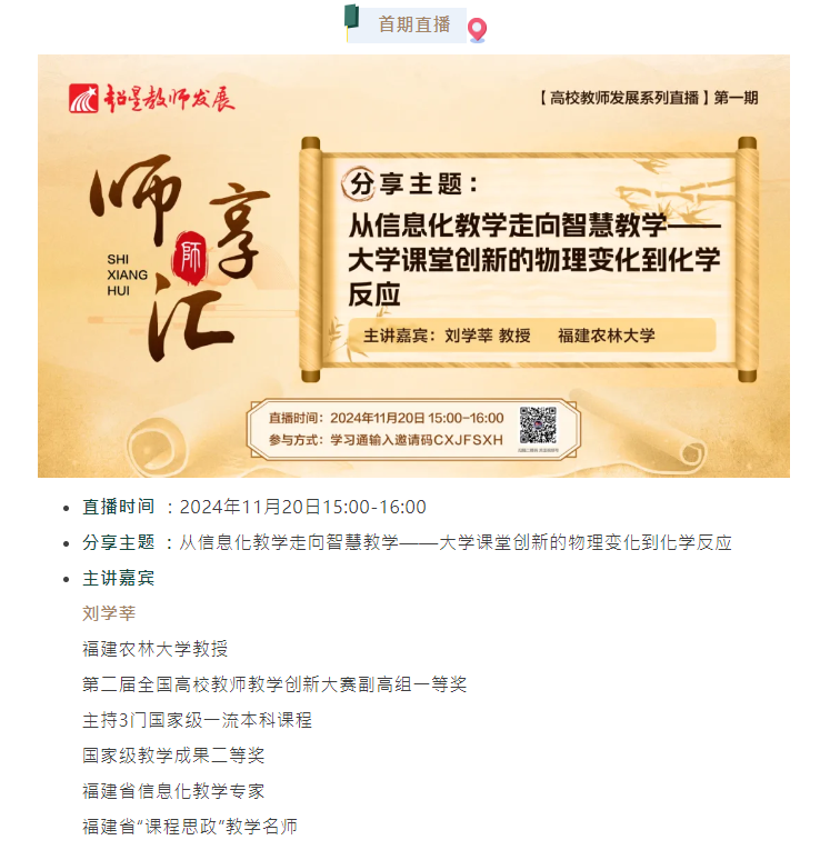 为顺应新时代教师发展工作模式创新,推进教师发展数字化转型,为构建高校教师教学发展体系提供前沿、高质量的内容支持,超星教师发展中心于2024年11月启动【师享汇】系列线上公益直播讲座,邀请来自国内一流高校专家学者,紧扣人工智能赋能教学、智慧课程建设、教学创新等高等教育热点议题,与全国高校教师每周三下午相约云端,共话教师专业发展变革新范式。在这里,教师们深度剖析前沿教学理念与教学实践案例,为高校教师搭建教学智慧的沟通桥梁。