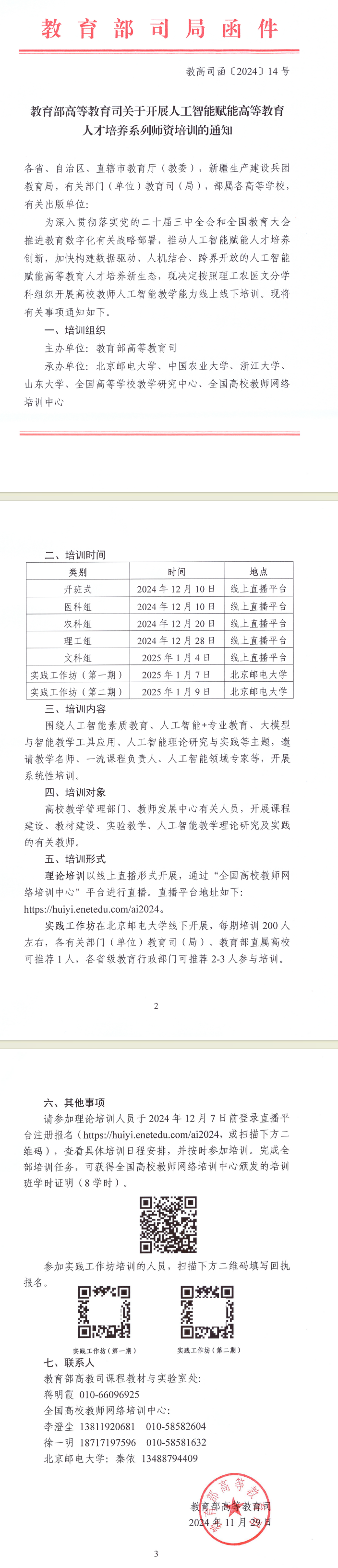 教育部高等教育司将于2024年12月10日至2025年1月4日期间,分学科组织开展高校教师人工智能教学能力线上培训请各部门、二级学院通知有意向参加的老师们于2024年12月7日前登录直播平台注册报名(http://huiyi.enetedu.com/ai2024),查看具体培训日程安排,并按时参加培训(各二级学院参培人数不低于20人)。完成培训任务获得学时证明后,请以部门为单位于2025年1月5日将证书(以教师姓名命名)和参培人员汇总表压缩发送至邮箱(423535622@gq.com)。具体培训日程安排(见附件)。
