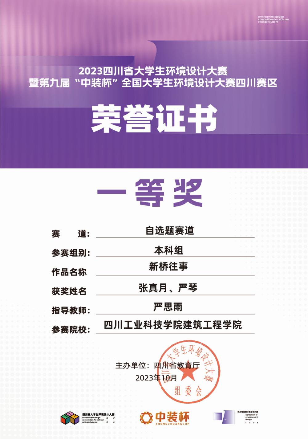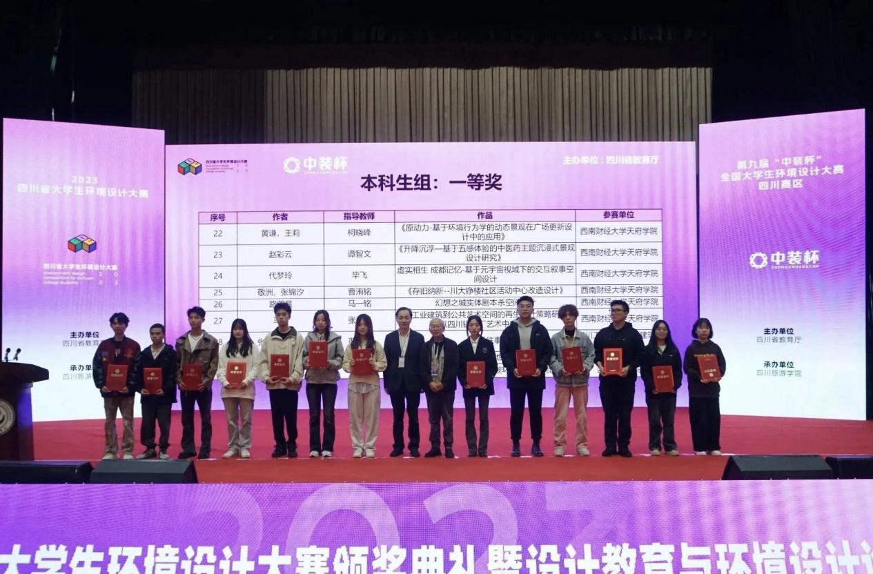 近日,由四川省教育厅主办,四川旅游学院承办,中国民主同盟四川省委员会、中国建筑学会室内设计分会、中国建筑装饰协会指导的2023四川省大学生环境设计大赛暨第九届“中装杯”全国大学生环境设计大赛四川赛区颁奖典礼在四川旅游学院举行。经过激烈的角逐,我院选送的师生作品荣获一等奖1项、二等奖2项、三等奖3项。
