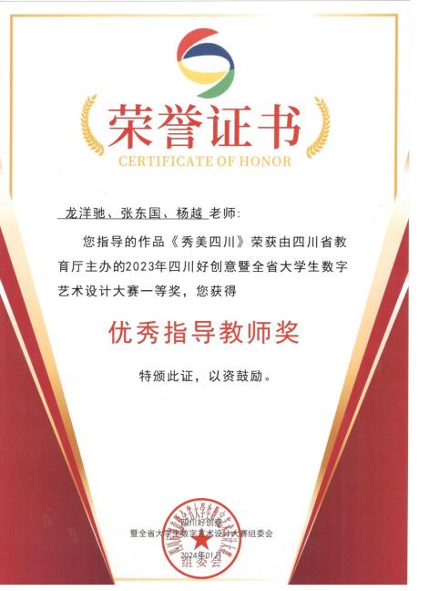 近日,由四川省教育厅主办,成都大学承办的2023年第二届四川好创意暨全省大学生数字艺术设计大赛结果出炉,我院专任教师张东国、陈鹏羽、龙洋驰、杨越等老师荣获优秀指导老师奖。