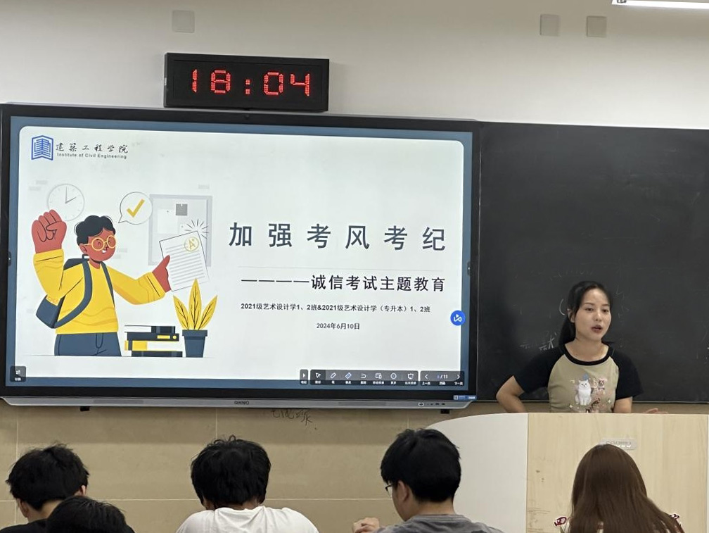 各班辅导员“从提高修养,做诚信学生”、“自觉维护个人名誉,端正考试态度”、“严守制度,展现诚信品质”、“诚信考试从我做起,从现在做起”等方面展开教育引导,加强学生对诚信考试重要性和必要性的认识,引导学生端正学习态度,诚信做人,认真复习备考,夯实专业知识,养成自觉遵守校规校纪的良好品质,自觉抵制作弊行为,立志成为一名诚信守信的学生。