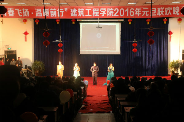2016年1月3日,建筑工程学院“青春飞扬·温暖前行”2016年元旦联欢晚会在绵竹校区东阶梯报告厅隆重举行。当晚,东阶梯礼堂内华灯璀璨,座无虚席,整个礼堂洋溢着新年的欢乐气息。建筑工程学院党支部书记胡亮、团总支书记李军以及绵竹校区建筑工程学院教师、辅导员与全院学生共聚一堂,喜迎新年的到来。