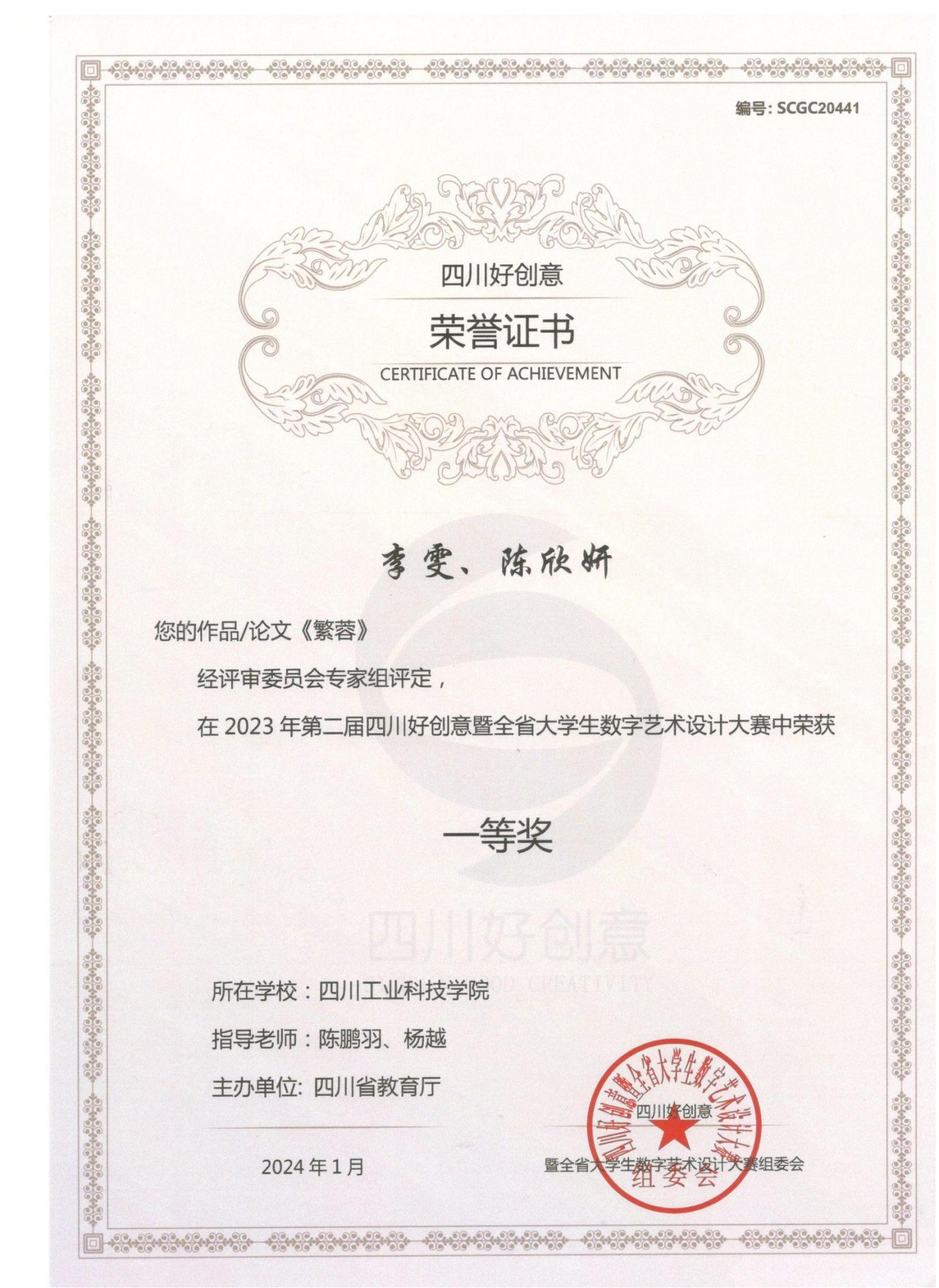 近日,由四川省教育厅主办,成都大学承办的2023年第二届四川好创意暨全省大学生数字艺术设计大赛结果出炉,我院艺术设计学生斩获一等奖2项,二等奖2项,三等奖5项,专任教师张东国、陈鹏羽、龙洋驰、杨越等老师荣获优秀指导老师奖。