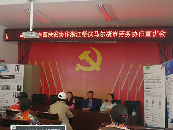 为全面贯彻党的十九大精神,助推乡村振兴战略,促进学校对口帮扶深度贫困乡镇沙尔宗镇农村劳动力特别是建档立卡贫困劳动力转移就业。近日,学院驻村扶贫干部、沙尔宗镇党委副书记李军代表学校与马尔康市就业局牵头,将“2018年东西协作浙江帮扶马尔康市的劳务协作宣讲会”引到了沙尔宗镇各个村的农牧民夜校,同时争取到了5家浙江企业到村开展招聘,提供就业岗位50余个。