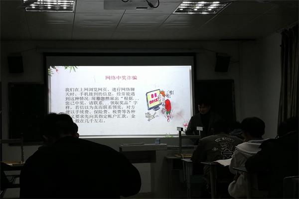 大学生们涉世未深、疏于防范,再加上不法分子利用现代科技的漏洞,往往大学生就是不法分子诈骗的目标。骗子的手法变化多端,稍不留神就被忽悠过去。诈骗分子利用部分同学的虚荣心、贪便宜、单纯等心理特点实施各种诈骗伎俩,使部分同学蒙受巨大的财产损失和精神压力。为增强同学们防骗意识,提高自我防范能力,我院18级机械电子4班开展“防网络诈骗”主题班会。
