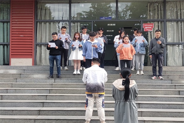 4月25日,智能学院参加诗歌朗诵比赛的师生在汽修102教室前进行有序排练,指导老师就朗诵的语调、声音的高低以及朗诵时的感情进行指导分析。