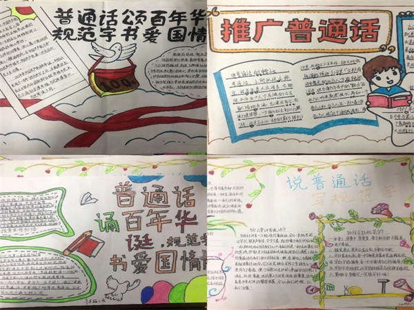 让同学们自己设计展板,自己查阅质料,合作完成推广普通话的海报,既为新学期的学习生活添加了新鲜的调味料,又再次增长了同学们用好祖国语言文字的意识,促进了我校推广普通话和语言文字规范化工作不断深入和拓展文明用语。