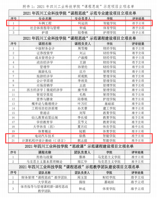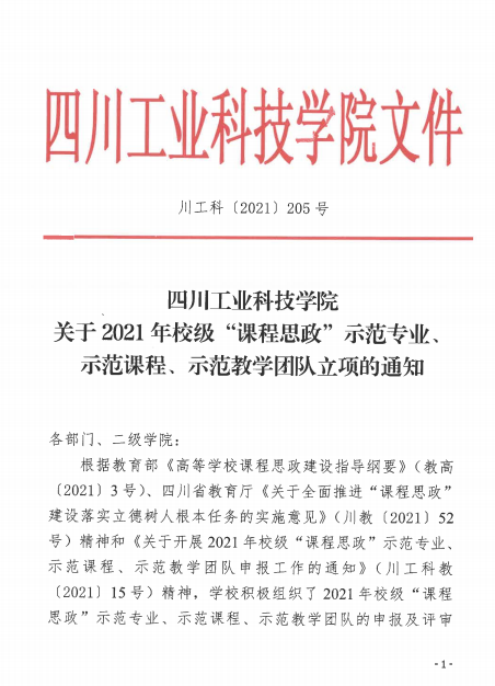 2021年11月17日,根据学校下发的《四川工业科技学院关于2021年校级“课程思政”示范专业、示范课程、示范教学团队立项的通知》(