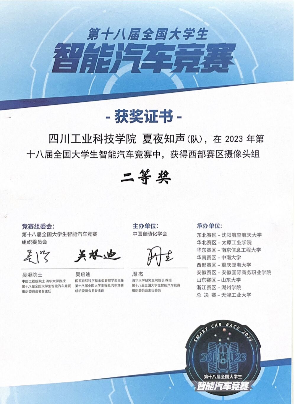其中三轮摄像头组“夏夜知声队”在预赛66支队伍中排名第九,挺进决赛,在决赛中击败了西北工业大学,西南交通大学,火箭军工程大学,长安大学,西华大学等知名院校,最终获得第十五名的好成绩;极速越野组“狂飙小分队”在省赛中获得三轮摄像头组三等奖,在不到一个月的西部赛备赛期内,转战极速越野组,最终获得该赛道西部赛二等奖。