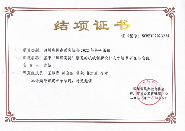 近日,接四川省民办教育协会通知,我院教师承担的5项四川省民办教育协会科研课题《基于“课证赛岗”融通的机械创新设计人才培养研究与实践》(证书编号:SCMBXH2023234)、《民办高校礼仪教育体系构建研究》(证书编号:SCMBXH2023235)、《民办高校创新应用型人才培养模式下课程教学改革研究——以〈机动车保险与理赔〉课程为例》(证书编号:SCMBXH2023236)、《基于SPOC的混合式课程建设及其在车辆工程专业教学中的应用研究》证书编号:SCMBXH2023237)和《民办高校“双创型”人才培养模式研究——以机器人工程专业人才培养为例》证书编号:SCMBXH2023248)顺利通过结题验收。