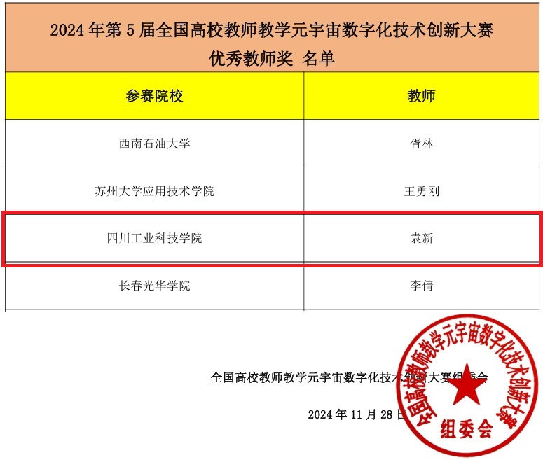 近日,第五届全国高校教师教学元宇宙数字化技术创新大赛总决赛在激烈的竞争中圆满落下帷幕。学校教师与来自北京大学、清华大学、西安交通大学、哈尔滨工业大学等众多高校的教师团队同台竞技,经过激烈角逐,袁新老师获优秀教师奖,钟全能团队、王静雯团队和刘家麟团队分别获全国二等奖1项,全国三等奖2项。